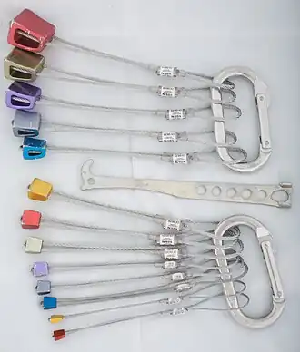 In rock climbing, a nut (or chock or chockstone or wire for the smallest versions) is a metal wedge threaded on a wire that climbers use for protection by wedging it into a crack in the rock. Quickdraws are clipped to the nut wire by the ascending climber and the rope threads through the quickdraw. Nuts come in a variety of sizes and styles, and several different brands are made by competing manufacturers. Most nuts are made of aluminum. Larger nuts may be threaded on Dyneema cord instead of wire, but this has become unusual.[1]
