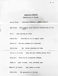 - ^ a b c d e "MOTION PICTURE PHOTO PLAY ENTITLED CHOCOLATE DYNAMITE"/"Copyright 1914 By Biograph Company 807 East 175th Street New York City", seven-page typed manuscript originally submitted to the United States government in February 1914 to obtain copyright protection for Biograph's film; documents held under collection heading "Chocolate Dynamite. Motion picture copyright descriptions collection. Class L, 1912-1977", L2233, in the Motion Picture, Broadcasting and Recorded Sound Division of the Library of Congress (LOC), Washington, D.C.; five of the seven pages of the manuscript comprise an outline subtitled "Description of Scenes". Retrieved via LOC's online collection search, June 27, 2023; hereinafter cited "LOC copyright, 1914".