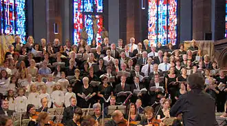 Once a year the choir performs a choral concert, since 1997 regularly on 3 October. They sang among others Mozart's Requiem, Schubert's Mass No. 5 in A-flat, Ein deutsches Requiem by Brahms, Rossini's Petite messe solennelle, Gounod's St. Cecilia Mass, and Verdi's Requiem.[5] Both Chor and Kinderchor appeared in performances of Hermann Suter's Le Laudi (1998 and 2007) and in 2004 in the German premiere of John Rutter's Mass of the Children. In 2006, Dessauer conducted Karl Jenkins' Requiem, composed in 2004.[1] In 2010, works of Bach were performed, his Mass in G minor and choral movements from cantatas BWV 140, BWV 12, BWV 120 and BWV 29.[6] In 2011 the choir sang Haydn's Die Schöpfung. The children's choir sang along with the soprano.[7]