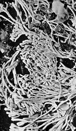| Choreonema thureti. A small portion of a clump of Jania ungulata showing, in the central part of the plate, the lateral subspherical pericarps of Choreonema | |