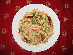 In Panama, chow mein is prepared with a mixture of onions, peppers, celery and carrots with pork or chicken and stir fried with noodles.[55][56] Another recipe includes canned corn.[57] In El Salvador, chow mein may contain carrots, cabbage or broccoli.[58][59] Another Salvadoran recipe includes potato and chayote.[60] In Guatemala, chow mein (or chao mein) is usually prepared with chayote and carrots and served on a corn tostada.[61][62][63]