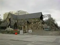 Earthquakes have repeatedly damaged the building (mostly the spire): in 1881, 1888, 1901, 1922, and 2010. The February 2011 Christchurch earthquake destroyed the spire and the upper portion of the tower, and severely damaged the rest of the building. A lower portion of the tower was demolished immediately following the 2011 earthquake to facilitate search and rescue operations. The remainder of the tower was demolished in March 2012. The badly damaged west wall, which contained the rose window, partially collapsed in the June 2011 earthquake and suffered further damage in the December 2011 earthquakes.[3] The Anglican Church decided to demolish the building and replace it with a new structure, but various groups opposed the church's intentions, with actions including taking a case to court. While the judgements were mostly in favour of the church, no further demolition occurred after the removal of the tower in early 2012. Government expressed its concern over the stalemate and appointed an independent negotiator and in September 2017, the Christchurch Diocesan Synod announced that ChristChurch Cathedral will be reinstated[4] after promises of extra grants and loans from local and central government.[5] By mid-2019 early design and stabilisation work had begun.[6]