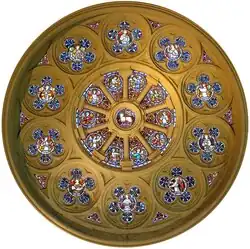 The rose window was designed by Mountfort, and was presented by Leonard Harper and his wife Joanna.[49] The window featured 31 sections and 4000 pieces of stained-glass,[49] made in London in 1881 by glass artisans Clayton and Bell.[50] The window was installed at the western end of the nave, 20 metres (66 ft) above the main door.[50] The window had a diameter of 7.5 metres (25 ft).[51] The artwork depicts the hierarchy of angels orbiting around the Lamb of God.[50]