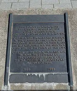 The European settlement of Christchurch was undertaken by the Canterbury Association, which was founded in London in 1848. That year, the Canterbury Association sent out Captain Joseph Thomas, accompanied by surveyors, to select and prepare a site for settlement. Thomas originally placed the principal town of the proposed settlement at the head of Lyttelton Harbour / Whakaraupō, but when he realised there was insufficient flat land there to meet the Canterbury Association's requirements, he relocated Christchurch to where he had previously placed a town called 'Stratford' at a point on the Avon where those coming up the river first encountered slightly higher, drier ground.[6] Back then, the Avon River / Ōtākaro was navigable as far as 'The Bricks' just upstream of the Barbadoes Street bridge. The site is these days marked by a riverbank cairn. The site got its name when the Deans Brothers in the 1840s had shipped bricks for their Riccarton homestead, located further up the river, which they unloaded in this location.