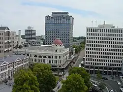 Christchurch Central City or Christchurch City Centre is the geographical centre and the heart of Christchurch, New Zealand. It is defined as the area within the Four Avenues (Bealey Avenue, Fitzgerald Avenue, Moorhouse Avenue and Deans Avenue[4]) and thus includes the densely built up central city, some less dense surrounding areas of residential, educational and industrial usage, and green space including Hagley Park, the Christchurch Botanic Gardens and the Barbadoes Street Cemetery.