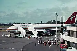 A 1,400 ft (427 m) southwest extension to runway 02/20 opened in November 1963, extending the runway to 8,000 ft (2,438 m) and providing for commercial jet operations.[13] In April 1965, scheduled jet services were launched by Qantas to Sydney using the Boeing 707.[14]