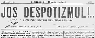 Rakovsky was drawn into a polemic with the Romanian authorities, facing public accusations that, as a Bulgarian, he lacked patriotism.[16] In return, he commented that, if patriotism meant "race prejudice, international and civil war, political tyranny and plutocratic domination", he refused to be identified with it.[27] Upon the outbreak of Romanian Peasants' Revolt of 1907, Rakovsky was especially vocal: he launched accusations at the National Liberal government, arguing that, having profited from the early antisemitic message of the revolt, it had violently repressed it from the moment peasants began to attack landowners.[9] Supportive of the thesis according to which the peasantry had revolutionary importance inside Romanian society and Eastern Europe at large, Rakovsky publicized his perspective in the socialist press (writing articles on the subject for România Muncitoare, L'Humanité, Avanti!, Vorwärts and others).[3]