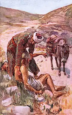 Traditional Christian ethics recognizes the command to "love thy neighbor" as one of the two primary commands called the "greatest commands" by Jesus.[92]: 24 This reflects an attitude that aims at promoting another person's good in what Stanley J. Grenz calls an "enlightened unselfishness".[93]: 175 When the Pharisee asked Jesus: "Who is my neighbor?" (Luke 10:29), Grenz says the questioner intended to limit the circle of those to whom this obligation was due, but Jesus responded by reversing the direction of the question into "To whom can I be a neighbor?".[93]: 107 In the parable of the "Good Samaritan", the use of a racially despised and religiously rejected individual as an example of the good, defines a neighbor as anyone who responds to those in need.[94]