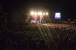 A Christian music festival (also known as a Jesus music festival or simply a Jesus festival) is a music festival held by the Christian community, in support of performers of Christian music. The festivals are characterized by more than just music; many feature motivational speakers and evangelists, and include seminars[1] on Christian spiritual and missions topics, service, and evangelism. They are often viewed as evangelical tools, and small festivals can draw 10 times the crowd of traditional revival meetings.[2] While the central theme of a Christian festival is Jesus Christ, the core appeal of a Christian music festival remains the artists and their music.[3][4][5] Critics point out that the dichotomy of business and religious interests can be problematic for Christian festivals. In similar ways as the Christian music industry in general, festivals can be drawn away from their central theme and gravitate toward commercialization and mainstream acts in an attempt to draw crowds.[1][6][7][8]