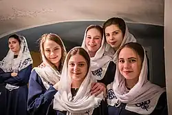 Christian head covering, also known as Christian veiling, is the traditional practice of women covering their head in a variety of Christian denominations. Some Christian women wear the head covering in public worship and during private prayer at home,[1][2][3] while others (particularly Conservative Anabaptists) believe women should wear head coverings at all times.[4] Among Catholic, Oriental and Eastern Orthodox Churches, certain theologians likewise teach that it is "expected of all women to be covered not only during liturgical periods of prayer, but at all times, for this was their honor and sign of authority given by our Lord",[5] while others have held that headcovering should at least be done during prayer and worship.[6][7] Genesis 24:65[8] records the veil as a feminine emblem of modesty.[9][10][1]