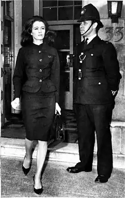 Ward's trial, which ran 22–31 July 1963, has been characterised as "an act of political revenge" for the embarrassment caused to the government. He was accused of living off immoral earnings earned through Keeler and Mandy Rice-Davies based on the small contributions to household expenses or loan repayments the two had made to Ward while living with him. Ward's professional earnings as an osteopath were a substantial £5,500 a year (£148,200 in 2023) at the time these small payments were made.[20] After a hostile summing-up from the trial judge, Ward was convicted, but took an overdose of barbiturates and died before the jury returned its verdict and sentence could be passed.[21] In the closing days of Ward's trial, Gordon's assault conviction was overturned by the Court of Appeal when his missing witnesses were found and testified that the evidence given by Keeler was substantially false.[22] In December 1963, Keeler pleaded guilty to charges of perjury before Sir Anthony Hawke, the Recorder of London, and was sentenced to nine months imprisonment, serving six months in prison.[23] Her cellmate while in prison was Elizabeth Crowley, the wife of East End bank robber William Crowley, the maternal grandparents of Labour MP Wes Streeting.