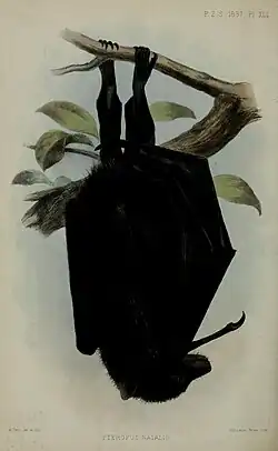 The Christmas Island flying fox was first described as Pteropus natalis in 1887 by British zoologist Oldfield Thomas, who sailed to Christmas Island on HMS Flying Fish, on the basis of two females and a newborn male.[2]
