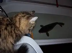 The carp is traditionally taken home and kept for a few days in a bathtub.[11][12] In the past, the carp was gutted the evening before at the latest and marinated in buttermilk overnight so that the strong taste was diluted.[13] Before carp farming, when the fish were still caught from ponds, it was often the case that the carp swam in clear water in the bathtub for a few days. This had the effect of soaking the carp and thus removing the muddy taste that arises when the fish takes in food from the pond mud.[14] By 2024, supermarkets in Poland, the Czech Republic and Slovakia had ended live carp sales.[15][16][17]