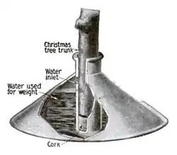 In 1919, an American monthly magazine Popular Science touted a new type of Christmas-tree stand.[4] The stand featured a broad, cone-shaped base that included an inlet for water and the Christmas tree trunk.[4] Water placed in the galvanized iron shell would give considerable weight to the stand to steady the tree. Once the tree trunk was inserted into the water inlet, the tree would be kept fresh and green much longer than without the water supply.[4]