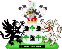 On the dexter side a gryphon Sable charged on the shoulder with four mullets in cross Argent on the sinister side a lion Argent charged on the shoulder with four roses also in cross Gules barbed and seeded Proper.
