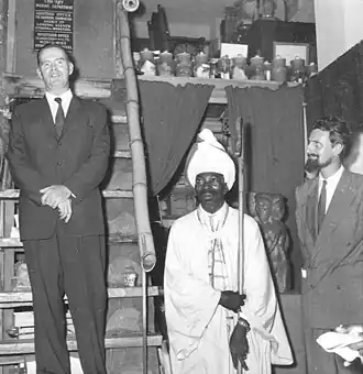 Hills also became an advocate for Jamaica's Rastafari movement, who were being oppressed in the late fifties.[42] He gave Rastafarians jobs as woodcarvers, free paints to poor artists, such as the now-famed Ras Dizzy and bailed them out of Spanish Town Prison while encouraging rasta brethren to sustain themselves through art and music. Christopher and Norah Hills were personally thanked for their years of support for struggling rastas by Mortimo Planno, the Rasta teacher of Bob Marley and one of the few Rastafarian elders[43] to have met with Emperor Haile Selassie in Addis Ababa, Ethiopia.