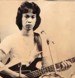 In the mid-1960s, the Nasution siblings formed a band; Chrisye and Joris watched them play songs by Uriah Heep and Blood, Sweat & Tears.[9] In 1968 Chrisye registered at the Christian University of Indonesia (UKI) to fulfill his father's wish that he become an engineer. Around 1969, however, Gauri invited him to join the Nasutions' band, Sabda Nada, as a replacement for their bassist Eddi Odek who was ill.[8][10] Pleased with his performance, the Nasutions asked him to stay as a permanent member. The group had a regular gig at Mini Disko on Juanda Street and freelanced at birthday and wedding parties.[10] When Chrisye had a chance to sing while performing covers, he attempted to sound as much like the original artist as he could.[11]
