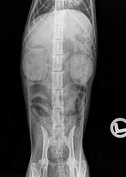An X-ray examination can be used to detect changes in the size, density and position of the kidneys as well as some urinary stones (struvite and calcium oxalate stones are "radiopaque") and soft tissue calcifications. In severely emaciated cats or fluid accumulations in the retroperitoneal space, however, the kidney can only be visualized to a limited extent on the X-ray image due to the resulting reduction in contrast. Excretory urography, in which a radiopaque contrast medium (e.g. Iopamidol, Iohexol) is injected into the bloodstream and its excretion via the kidneys is recorded radiographically. This makes it possible to detect circulatory disorders, dysfunctions of the renal corpuscles and obstructions of the outflow pathways.[22]