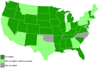 On election day, Baldwin was on ballot in 37 states.[33] He was a write-in candidate in eleven additional states including Montana where Ron Paul was listed as the party's nominee. Baldwin was completely absent from ballots in Oklahoma, North Carolina and the District of Columbia.[1]
