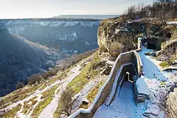 The Chufut-Kale (Crimean Tatar: Çufut Qale Tatar pronunciation: [tʃuˈfut qaˈle]; Russian: and Ukrainian: Чуфут-Кале, romanized: Chufut-Kale; Karaim: Кала, קלעה, romanized: Kala[1]) is a medieval city-fortress in the Crimean Mountains that now lies in ruins. It is a national monument of Crimean Karaites culture just 3 km (1.9 mi) east of Bakhchysarai.