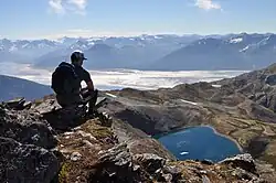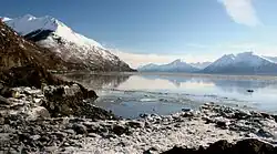 The Lakeside Trail travels 12.7 miles (20.4 kilometers) along the shores of Eklutna Lake until it reaches the mile-long Eklutna Glacier Trail that leads in short order to the moraines at the foot of the colossal blue ice of Eklutna Glacier.[8] In the summer, travelers go on foot, by mountain bike, ATV or on horseback, past the lake by way of largely flat trail to the glacier.[8] A traverse with three huts maintained by the Mountaineering Club of Alaska begins at the end of the trail and heads over the tops of the Eklutna, Whiteout, Eagle and Raven glaciers, and ends 31 miles (50 kilometers) away at Crow Pass near Girdwood on the opposite side of the park.[8] In wintertime, trail users are able to travel the same route by snowmobile (snowmachine), snowshoes or cross-country skis as permitted by regulation and weather conditions.[8] As most of the trail is an old roadbed, the trail is a popular winter destination for skijoring and dogsledding.[9] There are two remote campgrounds in the area in addition to a frontcountry campground open during the summer.[8] Two public use cabins are available for rent on the Lakeside Trail.[8] Non-motorized boats, and boats with an electric motor, are allowed on Eklutna Lake.[8] The tallest point in the park, Bashful Peak, towers over the lake at a height of 8,005 feet (2,440 meters).[10] Bush planes are able to land on the far (southern) side of Eklutna Lake at the unpaved Bold Airstrip.[11] North of Eklutna, the southern summit of Pioneer Peak can be reached from Knik River Road via the Pioneer Ridge Trail beginning outside the park boundaries in the Matanuska-Susitna Borough.[12][13]