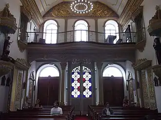 The ceiling is simple, in a truncated cradle vault, but has delicate coffered ceiling, and large medallions from which crystal chandeliers hang. At the junction between the ceiling and the walls there is a wide frieze of beautiful design. The choir over the main entrance is also richly adorned with gilded carvings and wrought iron railings, with a sinuous design supported by wooden columns enclosing three collapsed arches. Completing the decoration of the choir, above the front windows is a large frieze carved with scrolls, phytomorphic elements, and musical instruments. Below the choir is the carved signature of the master Couto e Silva.[2]