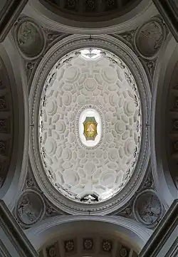 The church interior is both extraordinary and complex. The three principal parts can be identified vertically as the lower order at ground level, the transition zone of the pendentives and the oval coffered dome with its oval lantern.[6]