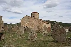 The present church has been built on several earlier churches of which remains have been well preserved. The foundation of the church, the massive columns, ground-plan and the octagonal tower which conceals an inner cupola are examples of the circular mausoleal architectural type used after Emperor Constantine (306–312).[1]