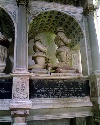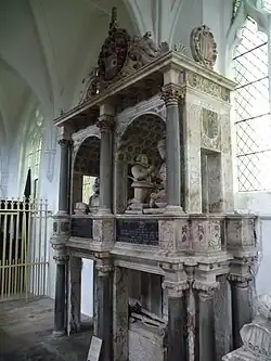 The second storey is supported on six pillars and the space is divided into two arched spaces. To the right and facing right in prayer is Sir George Shirley with his two sons behind him. All three figures are dressed in brightly painted period dress and the clothes include details in gold. In the left arch is his wife (d. 1595), daughter, and two babies.[16] According to the Latin inscription, Shirley's wife died aged 29 whilst giving birth.