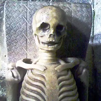 Three substantial tombs were constructed to memorialize Sir George Shirley, his father John, and his grandfather Thomas. By far the largest monument dominating the inside of the church is that dedicated to Sir George Shirley. It was made over 20 years before Shirley died in 1622. It is dated 1598 and consists of three storeys. On the bottom storey is a realistic skeleton carved from alabaster and showing the mortality of those portrayed above. The inclusion of this cadaver in the design was unusual for the time.[1]