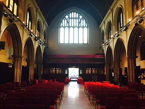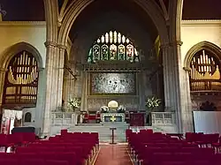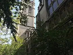 In 1898, the congregation built its current home, dubbed "the Cathedral of Universalism", at West 76th Street and Central Park West on New York City's Upper West Side. The architect, William Appleton Potter, based the design closely upon Magdalen Tower, Oxford, and buildings at Magdalen College. In 1993 Robert A. M. Stern and his co-authors described the church as "one of the few buildings to break from Central Park West's prevailing Classicism."[2][3] A rare design in English Perpendicular Gothic, it received praise from notable architects including Frank Lloyd Wright, whose daughter was married at the church. The church houses several significant artistic works, including an altar by Louis Comfort Tiffany, a bronze relief sculpture by Augustus Saint-Gaudens, a mosaic by J&R Lamb Studios, and stained glass windows by Clayton and Bell of London. The organ was donated by Andrew Carnegie and his wife, Louise Carnegie, the latter who was a member of the church.[4] Originally designed and constructed by the Hutchings-Votey Organ Company of Boston, the organ was rebuilt and revised by the Ernest M. Skinner Company.
