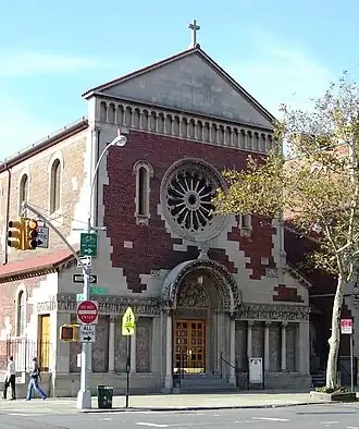The present Southern Sicilian Romanesque-style brick church at 193 Tenth Avenue was built 1930 to the designs of John Van Pelt of Van Pelt, Hardy & Goubert.[3] Plan were filed in 1929, and it was likely begun that year.[8] Stylistically, it is similar to Van Pelt's other churches in Manhattan and the Bronx. The church design "is reminiscent of the early Romanesque sculpture at the abbey of Moissac. Both churches have a scalloped profile that seems to incorporate a bit of Moorish influence. Both the human and animal forms are treated with the same incredible flexibility...."[3] The AIA Guide to New York City (1988) writes "The church's simple brick and limestone Southern Sicilian Romanesque facade merges with the Tuscan village forms of auxiliary buildings to the north in a well- related group."[5] AIA Guide to New York City (2010) describes the church as "lush brick and limestone, Italian Romanesque, backed up snug against the High Line. Despite the obvious difference in style and materials, the two were built around the same time."[6]