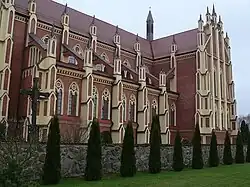The Church of the Holy Trinity is a typical example of the Neogothic style. Its height is 61 meter, and it's one of the tallest churches in Belarus.[1] The temple has three naves and a small transept, the naves are separated from each other by two rows of five columns each. There is no apse behind the presbytery. A characteristic element of the architecture of the temple are multi-stage buttresses, turning into flying buttresses. The walls of the temple are cut through with narrow lancet window openings in niches.[9]