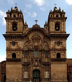 The Iglesia de la Compañía de Jesús (Church of the Society of Jesus) is a historic Jesuit church in Cusco, the ancient capital of the Inca Empire, in Cusco Region, Peru. It is situated in the Plaza de Armas de Cusco, the city center. It is built on an Inca palace.[2] It is one of the best examples of Spanish Baroque architecture in Peru. The architecture of this building exerted a great influence on the development of many Baroque architecture in the South Andes. Its construction began in 1576, but it was badly damaged in an earthquake in 1650. The rebuilt church was completed in 1673.
