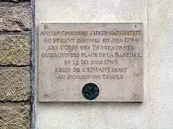 The Cimetière Sainte-Marguerite was a cemetery in a common ditch located between Paris and the village of Charonne during the French Revolution. It was level with 36 rue Saint-Bernard and beside Sainte-Marguerite church in the 11th arrondissement of Paris. It received 73 guillotined prisoners from place de la Bastille between 9 and 12 June 1794 then the first victims from place du Trône Renversé (now place de la Nation) before bodies from there started being sent to the cimetière de Picpus.