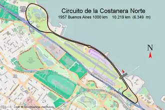 The Circuito Costanera (commonly known as the Costanera Circuit), was a Grand Prix circuit in Buenos Aires (Argentina). Two variants are known to have existed under Circuito "Avenida" Costanera and Costanera "Sur" which are listed by a few data sources as circuits used for the 1930, 1932 and 1936 Buenos Aires races.[1][2][3][4] Verifiable records can only confirm the Costanera Norte circuit layouts for the 1951 V Gran Premio General Perón (Feb. 18), V Gran Premio Eva Perón (Feb. 25), Gran Premio Eva Perón (Ciudad) Sport (March 18) and the 1957 1000 km de Buenos Aires.