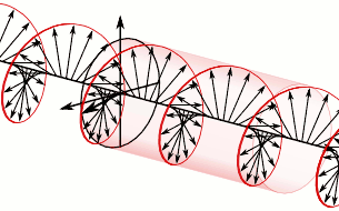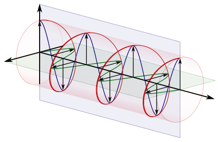 To appreciate how this quadrature phase shift corresponds to an electric field that rotates while maintaining a constant magnitude, imagine a dot traveling clockwise in a circle. Consider how the vertical and horizontal displacements of the dot, relative to the center of the circle, vary sinusoidally in time and are out of phase by one quarter of a cycle. The displacements are said to be out of phase by one quarter of a cycle because the horizontal maximum displacement (toward the left) is reached one quarter of a cycle before the vertical maximum displacement is reached. Now referring again to the illustration, imagine the center of the circle just described, traveling along the axis from the front to the back. The circling dot will trace out a helix with the displacement toward our viewing left, leading the vertical displacement. Just as the horizontal and vertical displacements of the rotating dot are out of phase by one quarter of a cycle in time, the magnitude of the horizontal and vertical components of the electric field are out of phase by one quarter of a wavelength.