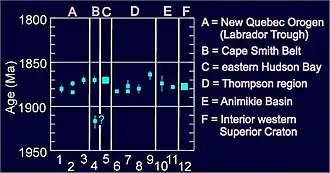 {{cite journal}}: CS1 maint: multiple names: authors list (link) - ^ a b c d e f g h i j k l m n o p q r s t u v w x y z aa ab ac ad ae af ag ah ai aj ak al am an ao ap aq ar as at au av aw ax ay az ba bb bc bd be bf bg bh "Ca. 1880 Ma Circum-Superior LIP". Ernst, Richard E. Retrieved 2010-01-10.