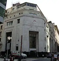 The headquarters of Citibank Argentina, at Bartolomé Mitre 502, are in the heart of the Buenos Aires financial district, and face the offices of the Bank of the Province of Buenos Aires and Banco Santander Argentina, two of its largest competitors. The building, notable for its Art Deco façade and main hall, was designed by Luis Aberastain Oro and Lyman Dudley, and completed in 1929. The building was also known in its early decades for the Club Americano, a social club located on the top floor, and popular with Buenos Aires' sizable American expatriate community.[11]
