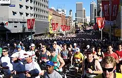 The City2Surf has been held as an annual event since the first run on 5 September 1971, initially as a 9.4-mile-long (15.1 km) run that commenced in George Street, adjacent to Sydney Town Hall.[2][3] It was conceived by the staff of The Sun newspaper and was inspired by the Bay to Breakers event in San Francisco. The first event was jointly organised by the Amateur Athletic Association of NSW and the NSW Women's Amateur Athletic Association and attracted 1,576 starters, 1,509 of whom completed the event within the 100 minutes time limit.[4] Many of the entrants were registered athletes belonging to the Registered Athletic Clubs that were part of these two bodies. To date, 24 of those entrants, now known as the City2Surf Legends, have run in every City2Surf.[2]