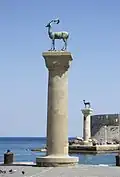 From top, left to right: View to Rhodes and the palace, statue of Diagoras of Rhodes carried by his sons, St. Catherine gate, Eleftherios Venizelos Street with the Konstantinos Karamanlis statue, view to the mosque of Suleiman, Rhodian Deer statues in the city's port, aerial view of the Palace of the Grand Master. | |