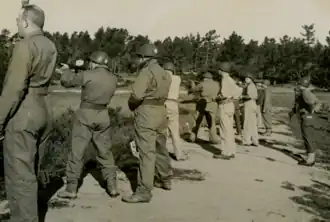 A full size civilian camp for displaced persons, occupying approximately ten acres was staked out and outlined in white tape on the Presidio of Monterrey. The camp layout was based on a recommended plan submitted to the Headquarters from the Theater.....Barbed wire fences, sanitary facilities and typical sections of barracks and other buildings were constructed in the area - with detachments participating in the construction. It was anticipated that the camp would make field problems relating to camps take on a more realistic aspect in addition to the training aid, which the actual layout would provide.[19]