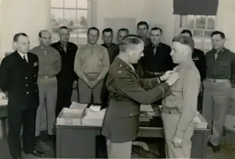 Civil Affairs activities received additional recognition ... when Lieutenant Colonel Presley W. Melton, Ordnance Corps, received the Bronze Star for meritorious service in connection with military operations as a member of the G-5 Section of General Eisenhower's Headquarters, European Theater of Operations. The award was presented at a simple ceremony before the CASA staff by Colonel Hardy C. Dillard, Commanding Officer.[50]
