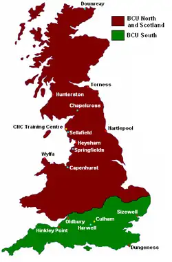 - B Division – Headquarters Culham, CLD (Training). Nuclear sites, Hunterston, Torness, Hartlepool, Heysham, Hinkley Point, Sizewell, Dungeness and Harwell. Gas Plants, St Fergus, Garlogie, Easington and Bacton.