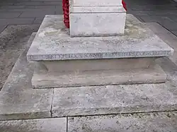 On the front (north) face is inscribed the dedication THIS COLUMN WAS ERECTED BY THE 15TH COUNTY OF LONDON BATTALION THE LONDON REGIMENT PRINCE OF WALES OWN CIVIL SERVICE RIFLES, while the south face reads: IN MEMORY OF THE 1240 MEMBERS WHO FELL WHILE SERVING WITH THE REGIMENT IN THE GREAT WAR THEIR NAMES ARE RECORDED ON A SCROLL PLACED WITHIN THIS COLUMN / ALSO IN MEMORY OF MEMBERS OF THE CIVIL SERVICE CADET BATTALION. The start and end dates of the war are inscribed in Roman numerals below the urn, "MCMXIV" on the north side and "MCMXIX" on the south, denoting the war's official end with the Treaty of Versailles. The regiment's battle honours are inscribed around the base: Festubert, Loos, Somme, and Flers–Courcelette on the south side; Doiran, Lys/Kemmel, Gaza, Nebi Samwil, and Jerusalem on the west; St Quentin, Albert, Ancre, Bapaume, and Selle on the north; and Transloy, Messines, Ypres, and Cambrai on the east face.[1]