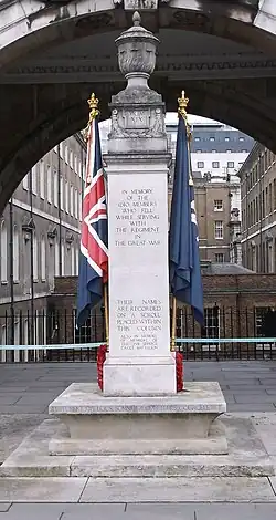 The memorial is in the form of a single rectangular column of Portland stone, which is decorated with classical mouldings and stands approximately 4.9 metres (16 feet) tall. At the top is a shallow cornice, on which stands a plinth supporting a sculpture of an urn at the very top. The plinth is decorated with laurel swags. The column itself stands on a square, coved base which in turn rests on a platform of two square steps. Painted stone flags hang from either side of the column—the regiment's colours on the east side (the right, when viewed from the front) and the Union Flag on the west (left). The flags were originally copper but were later replaced with carved stone. No names are listed on the memorial, but a scroll containing the names of the regiment's dead from the First World War was placed inside the column.[1][8][9][10] Lutyens intended his design to be harmonious with the surrounding stone architecture of Somerset House, though the polychromy of the flags stood out. Painted stone flags are a recurring feature in Lutyens's war memorial designs; he first proposed them for the Cenotaph, where they were rejected in favour of fabric, though they feature on several of his other designs.[7]