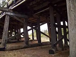 The bridge has undergone multiple alterations, but the original piers remain. They were constructed as "four rounded braced wandoo piles supported from horizontal 450mm timber sills, adzed to 400mm, fixed to concrete footings",[1]: 9 with the footings designed to bear on foundation rocks one and a half metres (4 ft 11 in) beneath the surface. The bridge's original spans were made up of seven rounded timber wandoo stringers,[note 1] of at least 400 millimetres (16 in) diameter, bearing on jarrah corbels,[note 2] supported by jarrah half caps[note 3] 600 by 150 millimetres (23.6 by 5.9 in) in size. The 14-metre-long (46 ft) span over the railway alignment was originally supported on four 610-by-190-millimetre (24.0 by 7.5 in) steel beams, weighing 41 kilograms (90 lb) each.[1]: 8–9