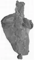 The chondrocranium was low, with a broad and triangular sphenoid region (above and between the eyes) followed by a somewhat smaller otic region (above the hindbrain and balance organs).[13][2] The ethmoid region (between the nostrils) at the front of the chondrocranium is unknown, but it was likely far shorter than the overhanging rostrum ("snout") of modern sharks.[14] The underside of the chondrocranium is perforated by various nerve and blood vessel openings.[14] A deep excavation is present at its rear tip, below the connection to the spinal column. This excavation contains a pair of closely spaced openings, where the two lateral branches of the dorsal aorta (a major artery) enter the braincase.[15][2] Cladoselache’s condition is intermediate between symmoriiforms (which have a single opening within the excavation) and other chondrichthyans (which have widely separated openings not confined to an excavation). Each branch of the dorsal aorta reemerges from the chondrocranium further forwards.[2]