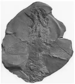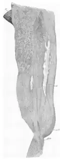 The spinal column of Cladoselache was cartilaginous and poorly preserved, without calcified centra (spool-shaped main components) encompassing the notochord.[11][10] Typically only the pointed, closely spaced neural arches can be observed in fossils.[10] All of the fins (except the caudal fin) have the same basic structure: a wide base which is continuous with the torso, and a subtriangular profile supported along nearly the whole length of the fin by cartilaginous rods known as radials. Only a few radials are segmented, with thicker radials concentrated at the front of each fin and thinner radials concentrated further back.[11][10][4]