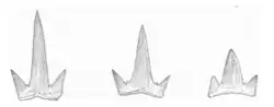 Like many other early chondrichthyans, Cladoselache had “cladodont” teeth, with a large and sharp central cusp surrounded by one or two pairs of smaller cusps. The median (central) cusp has a flat labial face (the side facing the cheek), in contrast to other “cladodonts” which had a convex labial face. The root of the tooth is broad and has a deeply arched concavity on its underside (known as a basiolabial depression), which is flanked by triangular projections.[4] Teeth at the front of the mouth were generally taller, with a long median cusp and two pairs of small and pointed lateral cusps, with the outer pair larger than the inner pair. Further back, the median cusp becomes shorter and the inner pair of lateral cusps shrink into oblivion, leaving only the outer pair. The teeth are thickly layered with typical dentine, but lack enamel (the hypercrystalline outer layering of osteichthyan teeth) or enameloid (an enamel-like form of dentine in shark teeth).[10]